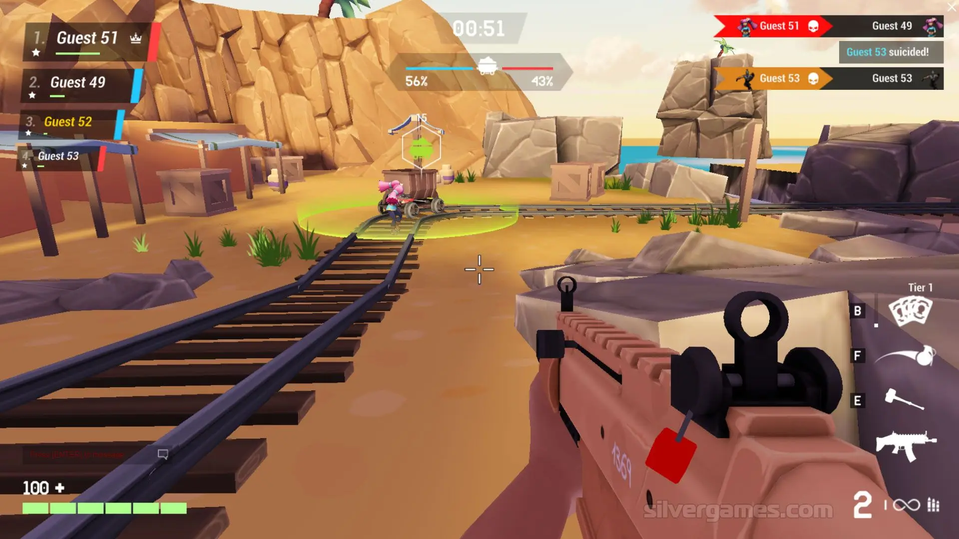 Venge.io is an online multiplayer shooter where you take up arms against two other real players in a battle arena. In order to upgrade your gear and get stronger, find all the glowing green spots on the map to claim those territories and complete objectives. You can switch weapons when you re-spawn, so no round will ever get boring. There are several weapons to choose from such as Scar, Shotgun, Tec-9 and even a Sniper rifle! Invite your friends by sharing the link in the lobby screen and enjoy this amazing game together!